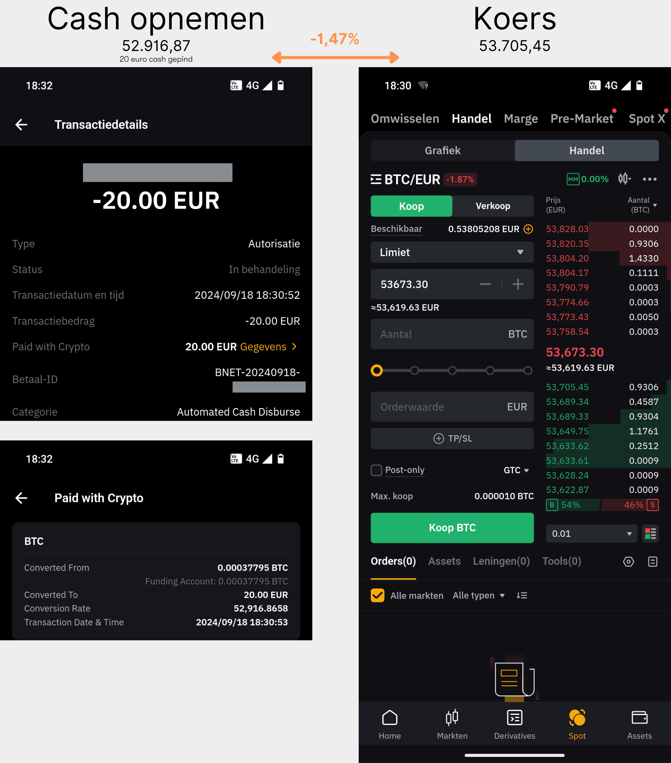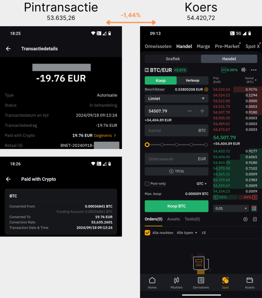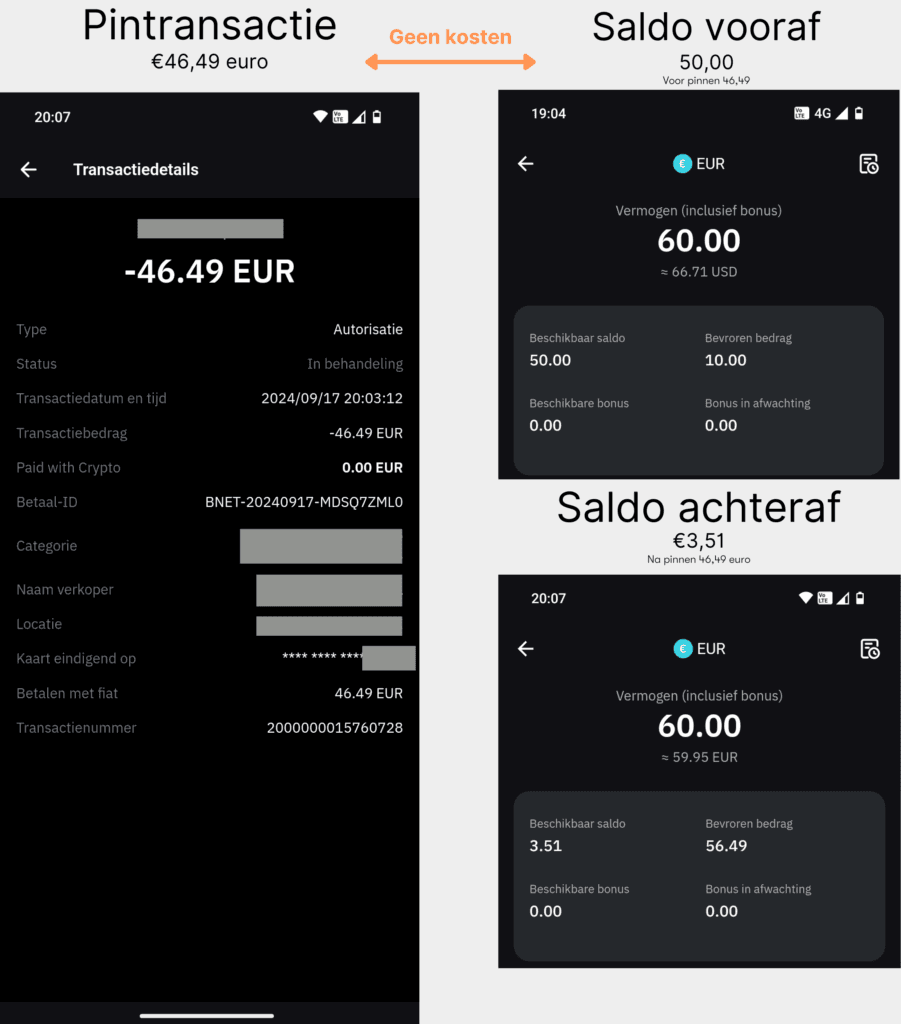 Indien je Bitcoin of een crypto gebruikt om uit te geven kost je dat 1,47% o.b.v. mijn praktijktest. Als je met euro betaalt kost dit je niks.
