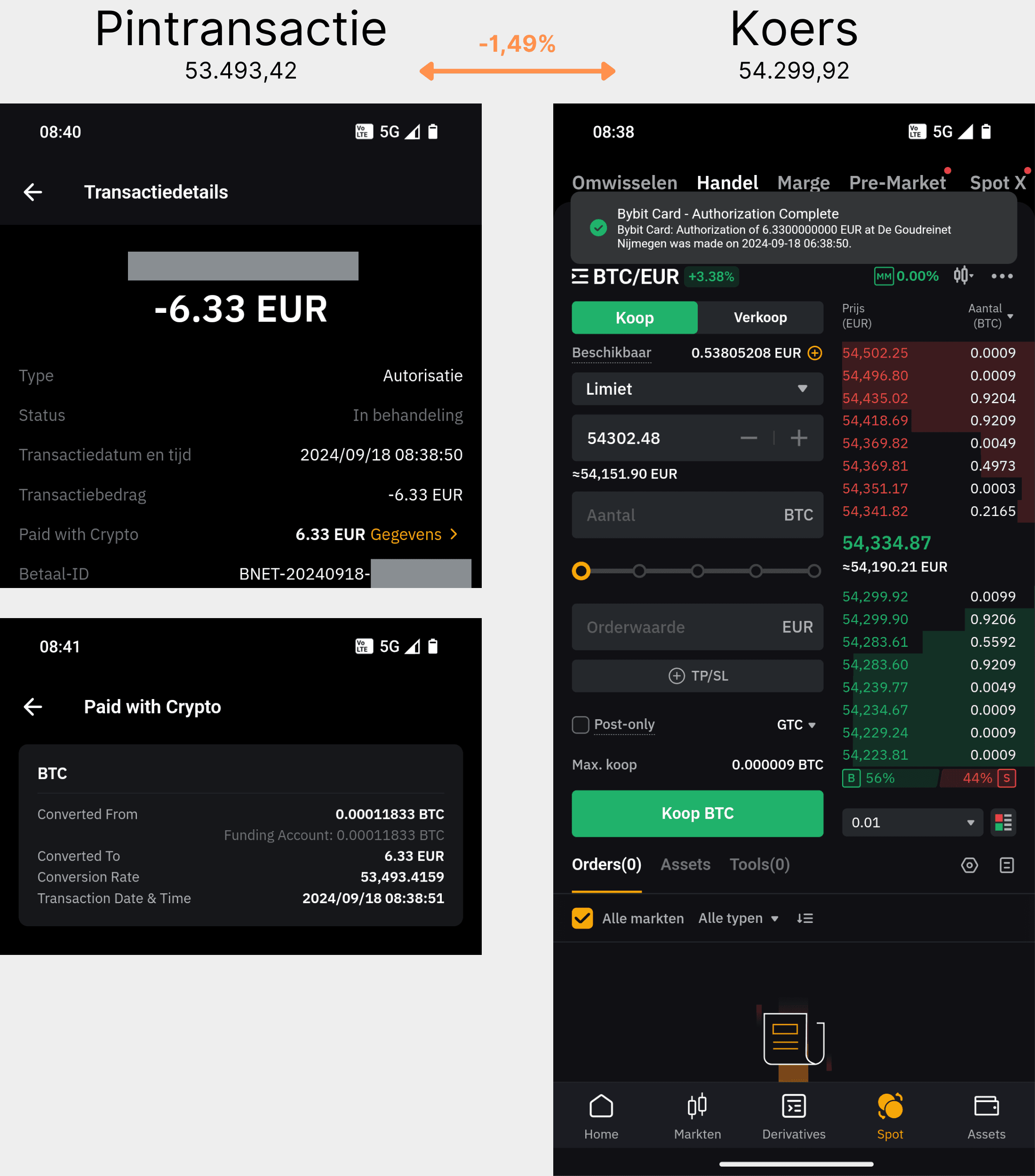 De transactiekosten die Bybit rekent zijn 0,9% bovenop de spot fee. Vermoedelijk is jouw spot fee taker fee bij de euro-crypto markt binnen Bybit 0,2%. Je totale transactiekosten komen dan uit op 1,1%. Echter in de praktijk zie ik dat het neer komt 1,40% tot 1,49%. Dit is dus ongeveer 0,3% tot 0,39% hoger. Waar dit verschil precies in zit weet ik niet.